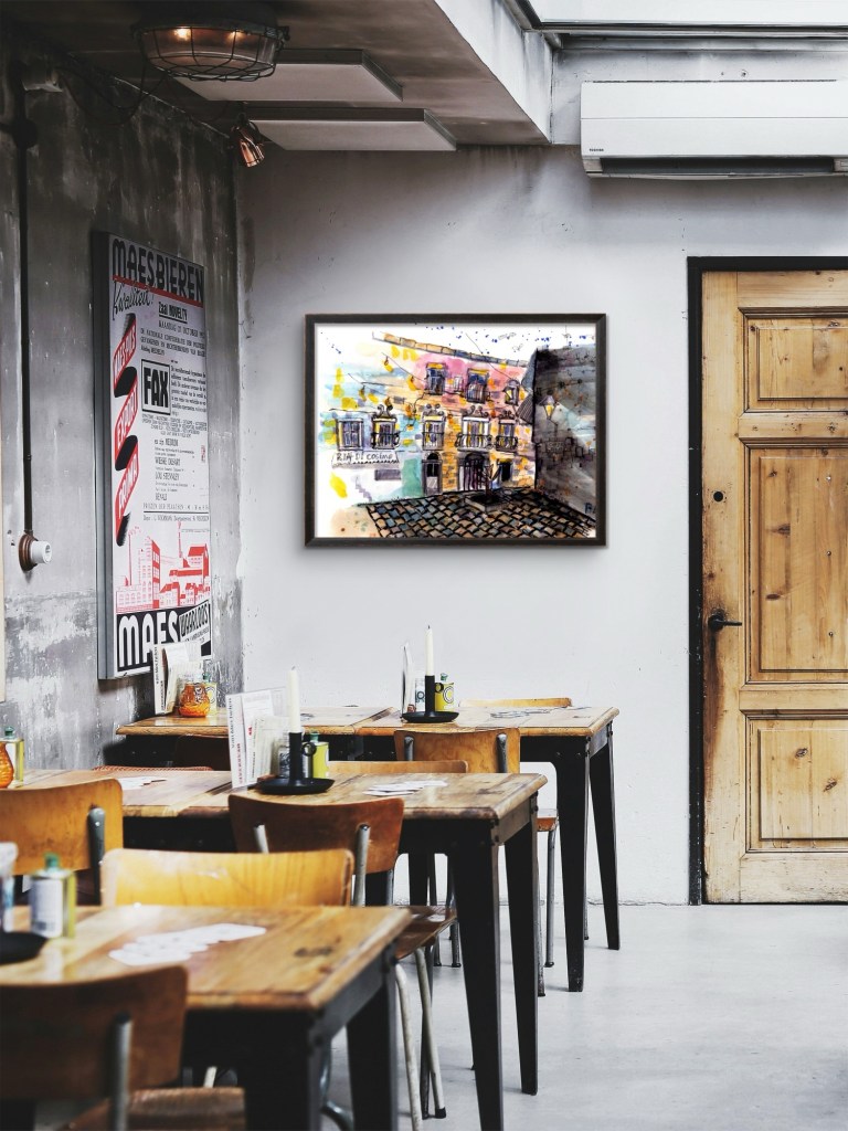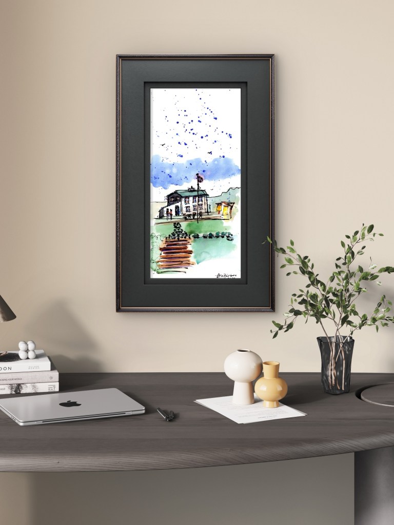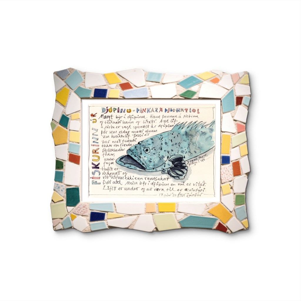 Teiknað með penna og vatnsheldu bleki, litað með vatnslitum.