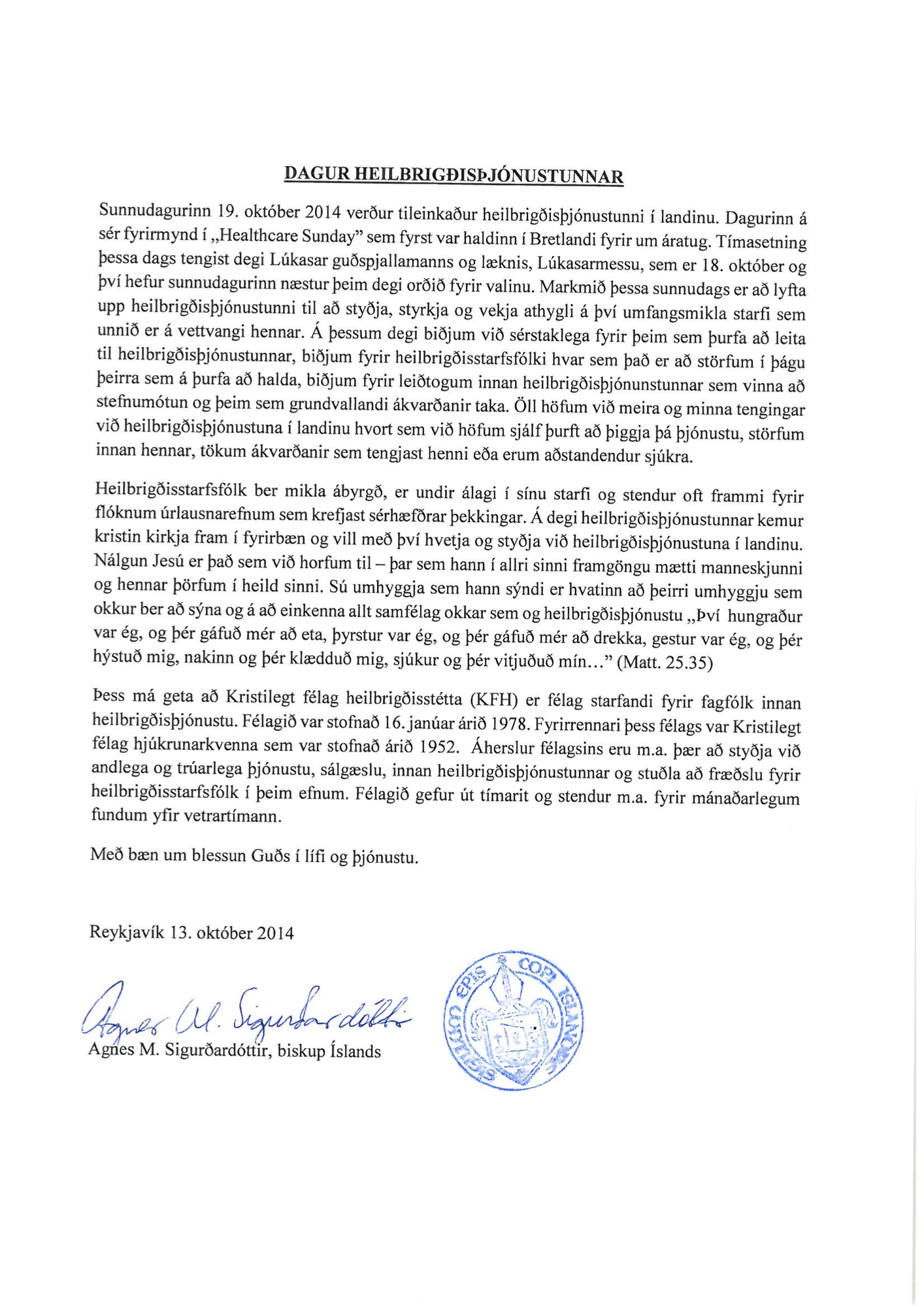 „Markmið þessa sunnudags er að lyfta upp heilbrigðisþjónustunni til að styðja, styrkja og vekja athygli á því umfangsmikla starfi sem unnið er á vettvangi hennar. [. . . ] Heilbrigðisstarfsfólk ber mikla ábyrgð, er undir álagi í sínu starfi og stendur oft frammi fyrir flóknum úrlausnarefnum sem krefjast sérhæfðrar þekkingar. Á degi heilbrigðisþjónustunnar kemur kristin kirkja fram í fyrribæn og vill með því hvetja og styðja við heilbrigðisþjónustuna í landinu. Nálgun Jesú er það sem við horfum til – þar sem hann í allri sinni framgöngu mætti manneskjunni og hennar þörfum í heild sinni. Sú umhyggja sem hann sýndi er hvatinn að þeirri umhyggju sem okkur ber að sýna og á að einkenna allt samfélag okkar og heilbrigðisþjónstu.“ Sjá bréfið allt neðanmáls.