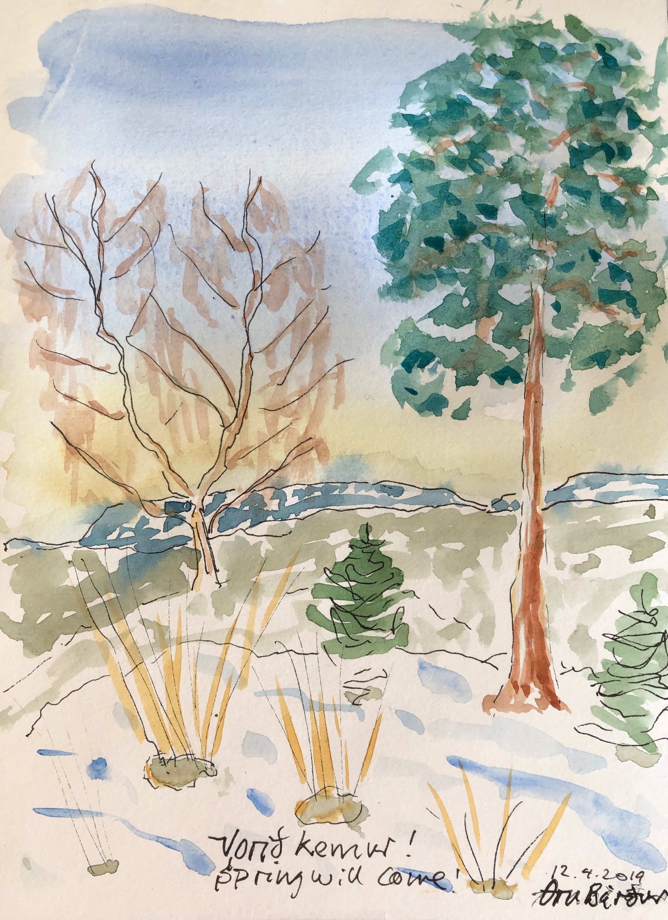Painted while having breakfast in Brumunddal, Norway. There have been some minus degrees Celcius during the past nights. Next week it will be warmer, I hope.
