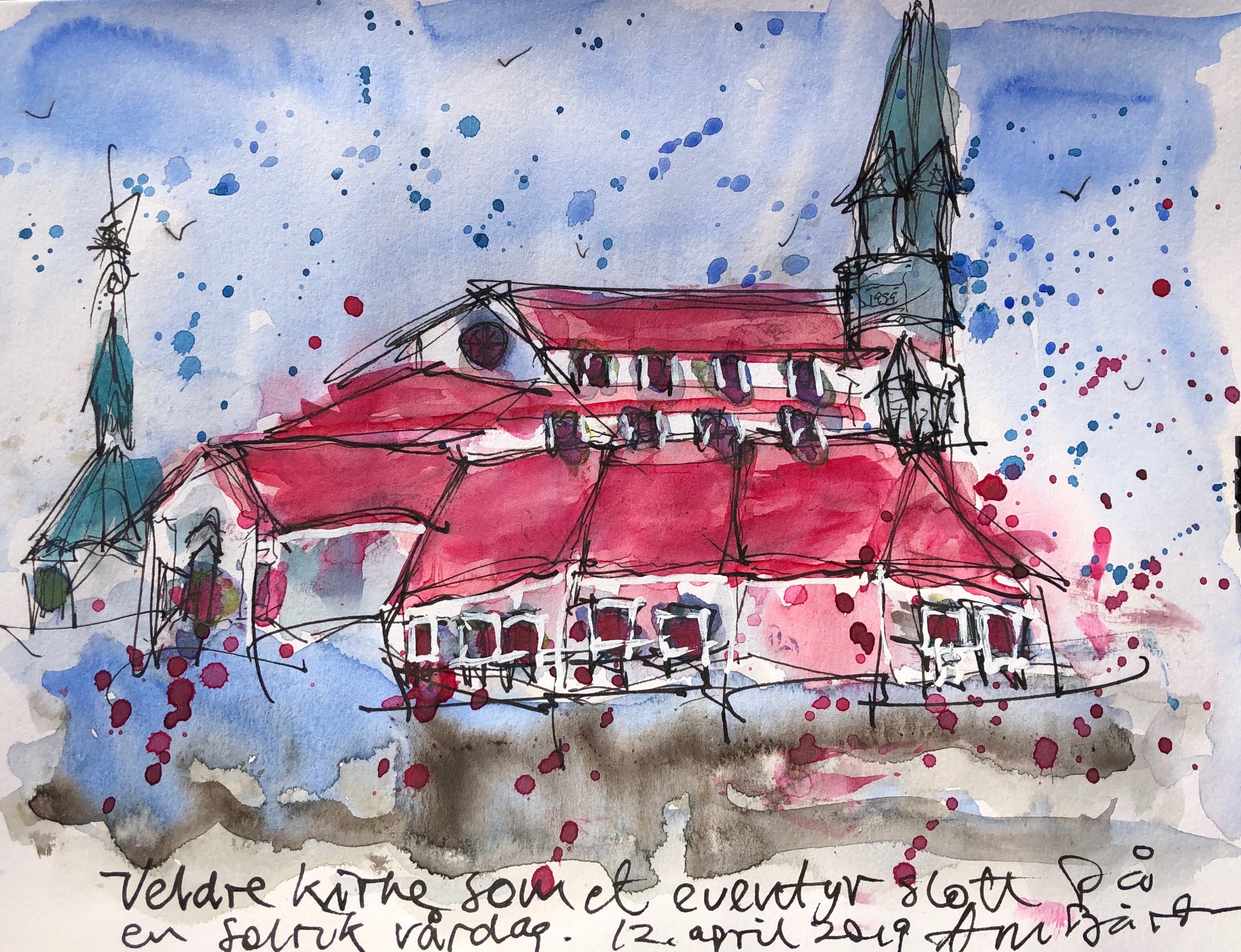 When is a sketch done? Sometimes you can add some strokes and colors. I did that indeed with this one of Veldre Church in Norway.