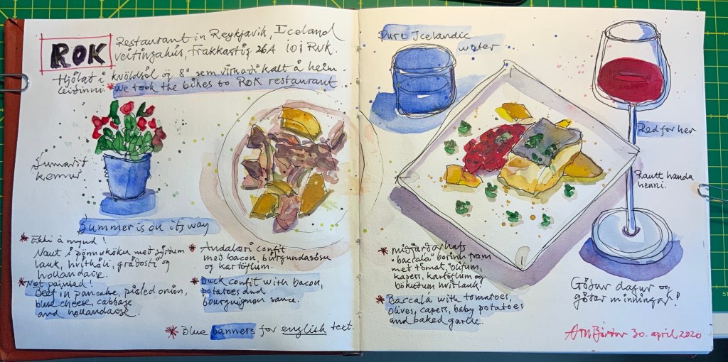Enjoying good food at ROK restaurant. Ink sketch and watercolour.