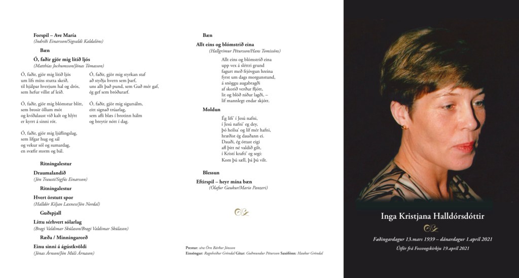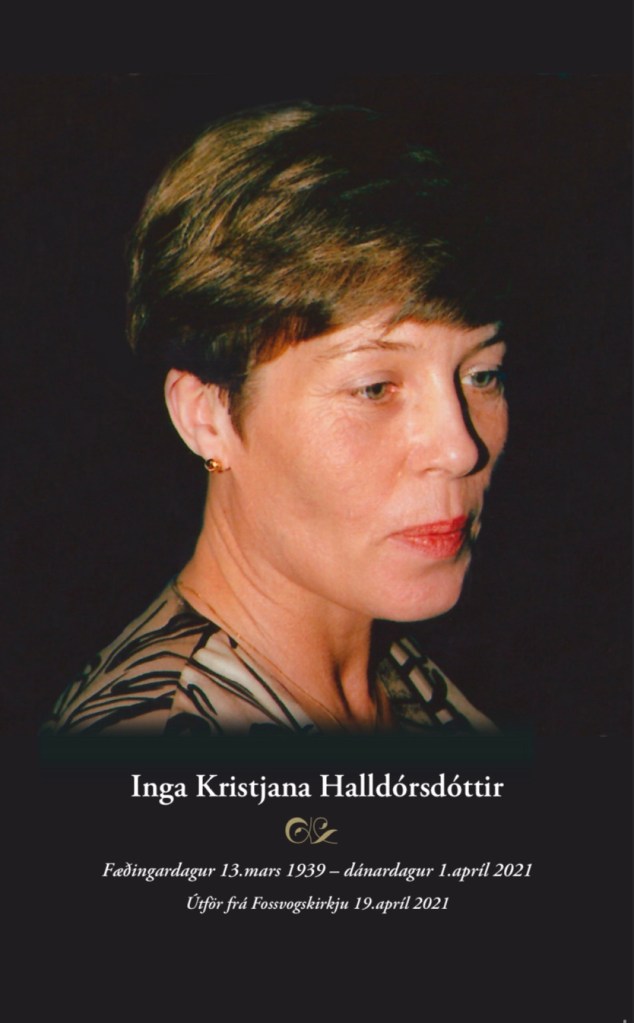 Við erum hér saman komin til að kveðja Ingu Kristjönu Halldórsdóttur sem fæddist á Ísafirði 13. mars 1939 og lést 1. apríl s.l. sem bar uppá skírdag. Börnin hennar sögðu að hún hefði svo sannarlega haft húmor fyrir því að deyja þann sérstaka dag, 1. apríl!
