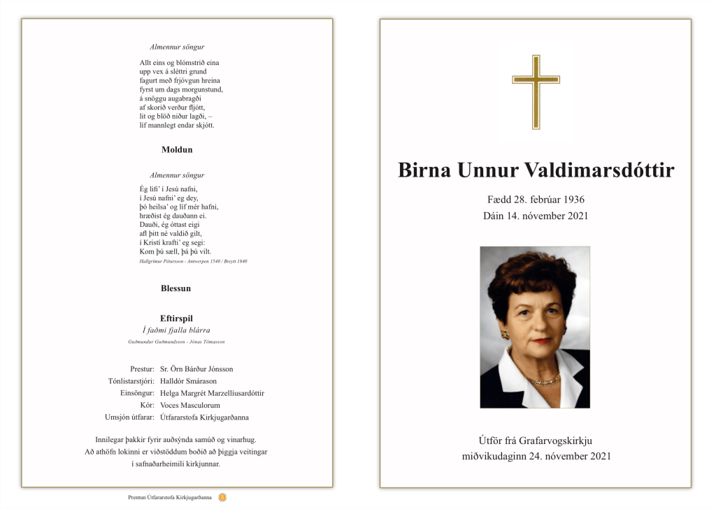 Birna Unnur Valdimarsdóttir fæddist 28. febrúar 1936 í Efri-Miðvík í Aðalvík í Sléttuhreppi, Norður Ísafjarðarsýslu. Hún lést á Líknardeild Landsspítalans í Kópavogi eftir stutta baráttu við krabbamein. Hún sagði nokkrum dögum fyrir anlát sitt: „Ég ætla að deyja um helgina?“ Og það varð. Hún lést sunnudaginn 14. nóvember 2021 á fæðingardegi föður síns. Hún var vön að segja hlutina umbúðalaust og með hugrekki í hjarta.