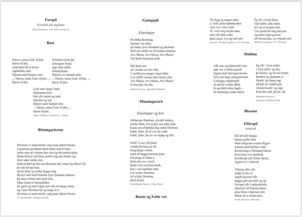– Bálför: Kistan verður ekki borin út en við kveðjum í kórnum og göngum réttsælis um kistuna og signum yfir höfðalagið sem er nær kórþrepum.