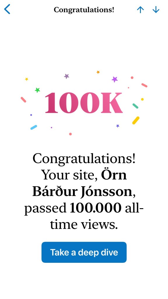 Nýlega sendi fyrirtækið, sem hýsir þessa síðu, hamingjuóskir til mín vegna þess að 100.000 heimsóknir voru skráðar hjá þeim.