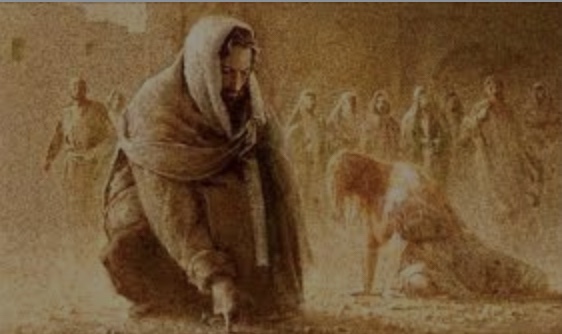 En hvað gerði Jesús? Hvernig svaraði hann spurningu hatursfullu karlanna? Hann laut niður og skrifaði í sandinn eitthvað sem enginn veit hvað var en sagði svo: