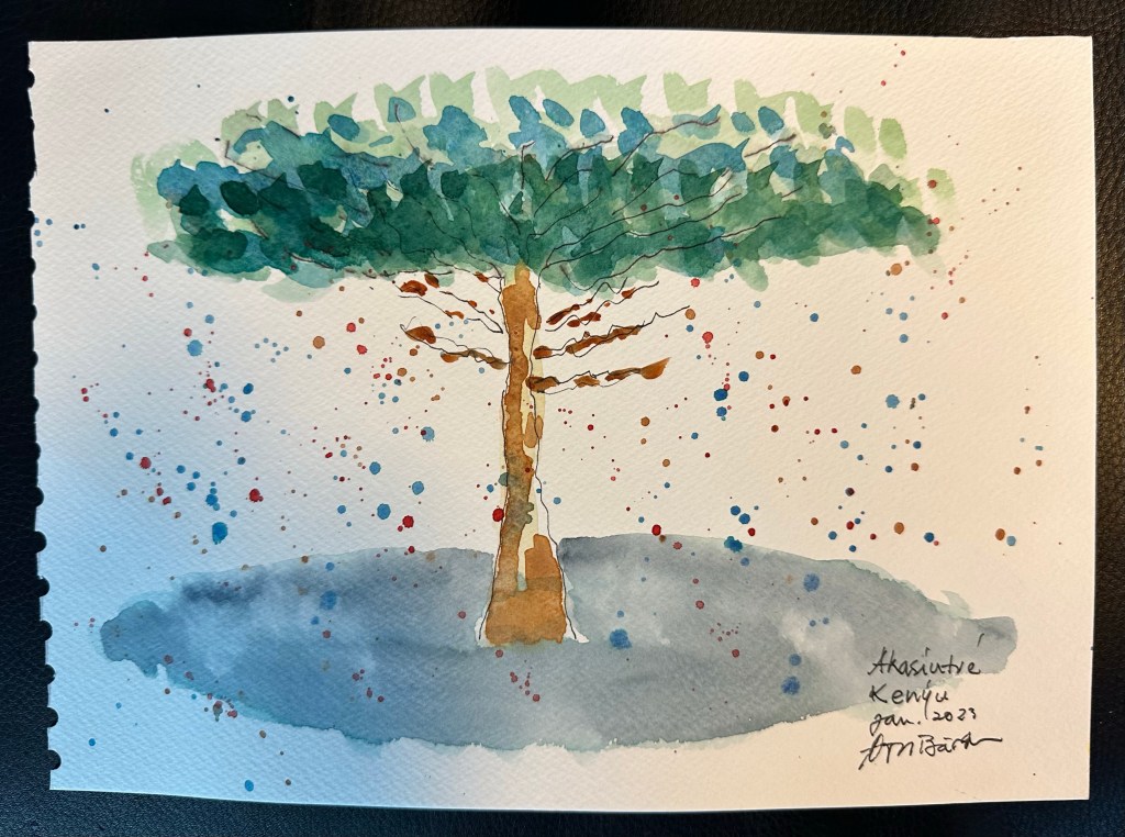 Fann á vefnum ljóðið Trees og glímdi við að snúa því á íslensku um bænadagana 2023. Árangurinn er hér fyrir neðan. En fyrst er vatnslitamynd af Akasíutré í Kenýu.