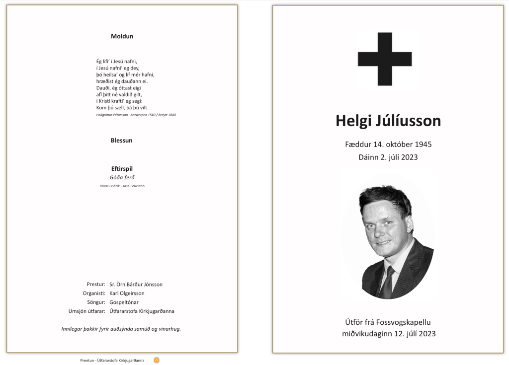 Við komum hingað saman á þessum sólbjarta degi til að kveðja Helga Júlíusson, sem var gæddur góðum gáfum. Líklegt er að
