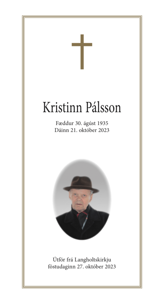 Og er það ekki dásamlegt til þess að hugsa, að einmitt á þessum sama degi, þegar Kristinn er jarðsunginn í Langholtskirkju í Reykjavík, var hann borinn til skírnar af elskandi foreldrum og skírður vestur í Djúpi, líklega í Unaðsdalskirkju, þennan dag fyrir 88 árum, sem þá bar uppá sunnudag, dag Drottins, en sunnudagur er upprisudagur Jesú Krists, sem með henni opnaði okkur leið til himinsins heim.