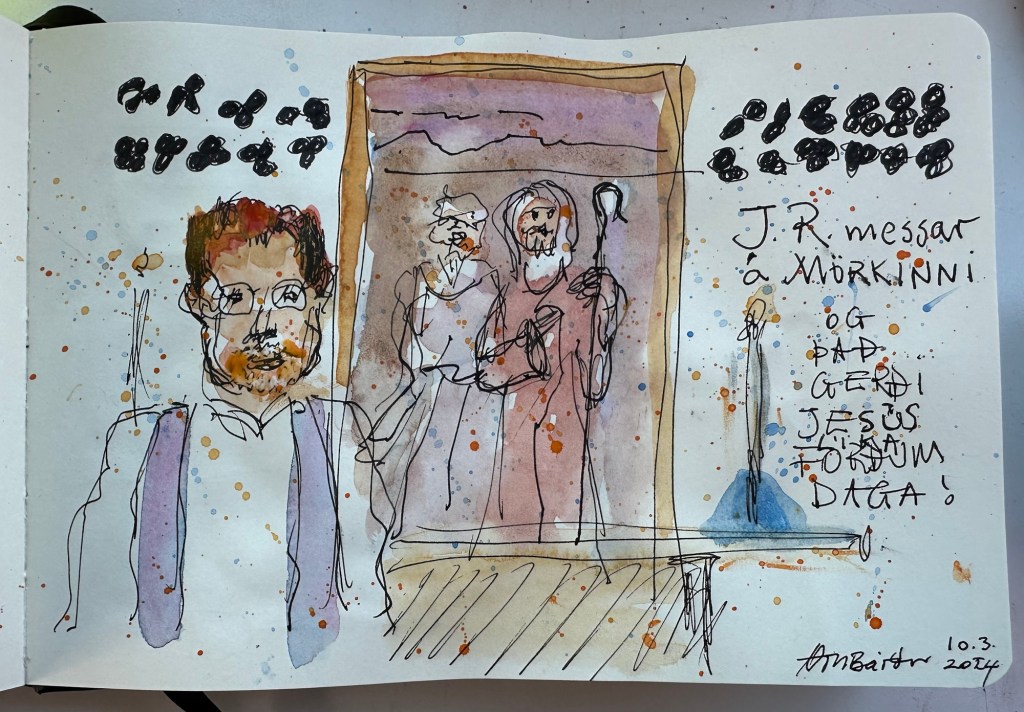 Skissaði í laumi mynd og litaði þegar heim kom. Hún er mér góð minning um atburðinn, en ég geri mér þó grein fyrir því, að portret af þessu tagi af prestinum, verður ekki notað í vegabréf!