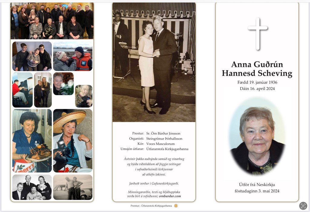Og nú erum við hér saman í Neskirkju til að kveðja hana Önnu Guðrúnu og þakka fyrir lífið hennar. Ég kynntist henni þegar ég jarðsöng Georg og þá sá ég hve gott og fjölbreytt líf þau höfðu átt saman í gagnkvæmri elsku og virðingu. Fyrir 17 árum vorum við saman hér og kvöddum Georg. Hún saknaði hans ætíð, saknaði góðu daganna þegar hann kom af sjónum, með gjafir og góðgerðir. Þá puntaði hún sig og gerði fína, klæddi sig í sterka liti og setti á varir sínar réttan lit. Fingurnir skörtuðu naglalakki í stíl, fagurt skart glitraði á örmum og hálsi. Þá var gaman að lifa og dansa.