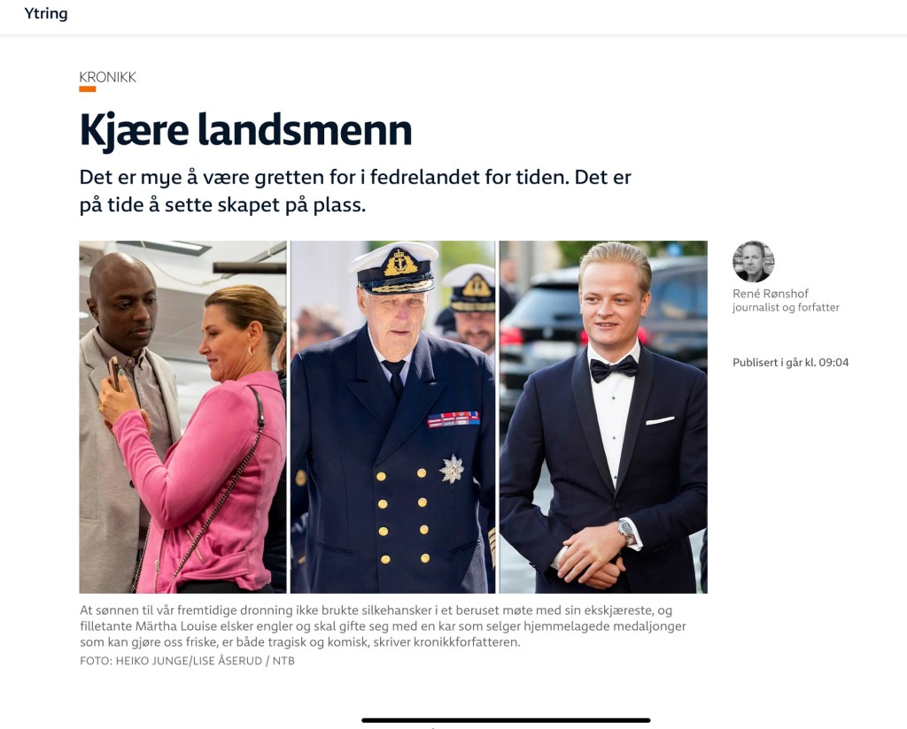 Að sonur verðandi drottningar okkar hafi ekki verið með silkihanska á fylleríi við fyrrverandi elskhuga sinn og Märtha Louise frænka elskar engla og ætlar að giftast náunga sem selur heimatilbúnar medalíur sem geta læknað okkur, er bæði sorglegt og kómískt.