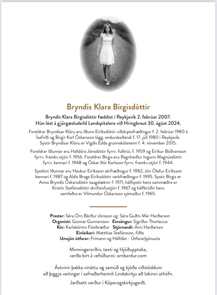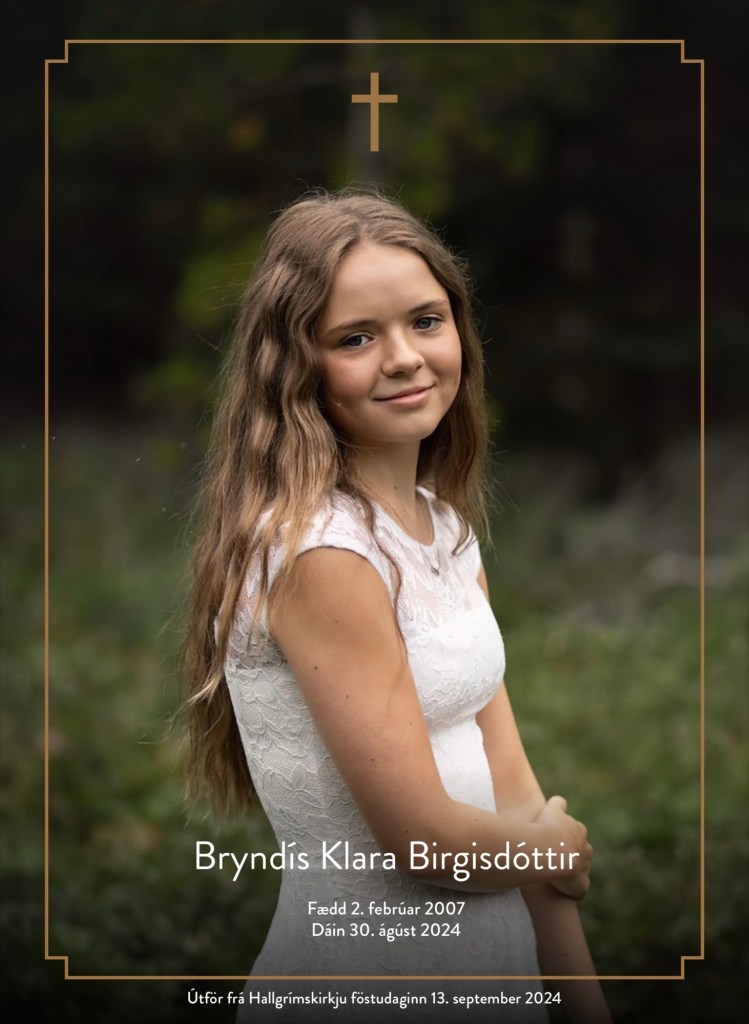 Bryndís Klara Birgisdóttir fæddist í Reykjavík 2. febrúar 2007. Hún lést á gjörgæsludeild Landspítalans við Hringbraut 30. ágúst 2024.
