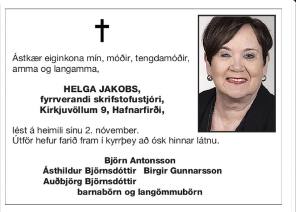 Svo mörg voru þau orð. En nú snúum við okkur að henni, Helgu Jakobsdóttur, sem fæddist í Reykjavík 5. ágúst 1948 og lést í Hafnarfirði 2. nóv. 2024.