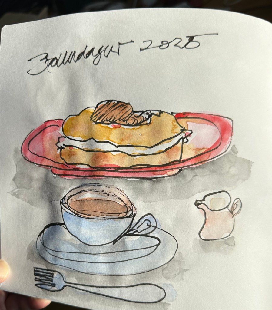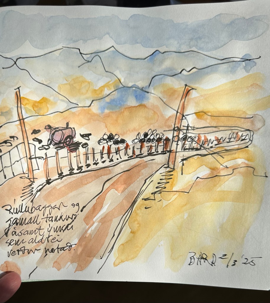 Nokkrar skissur liðinna daga, gerðar með blekpenna og vatnslitum og ljósmyndir.