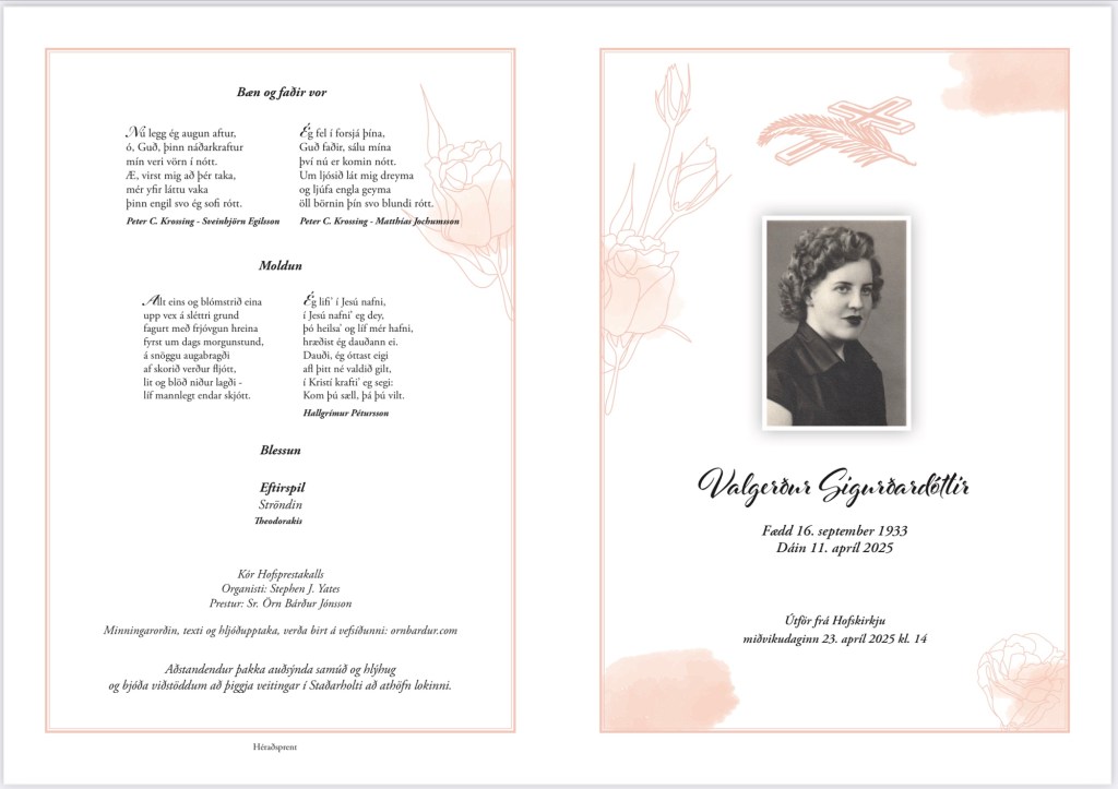 Valgerður Sigurðardóttir fæddist 16. september 1933 á Ljótsstöðum, Vesturárdal í Vopnafirði. Hún lést á hjúkrunarheimilinu Dyngju, Egilsstöðum þann 11. apríl síðastliðinn.