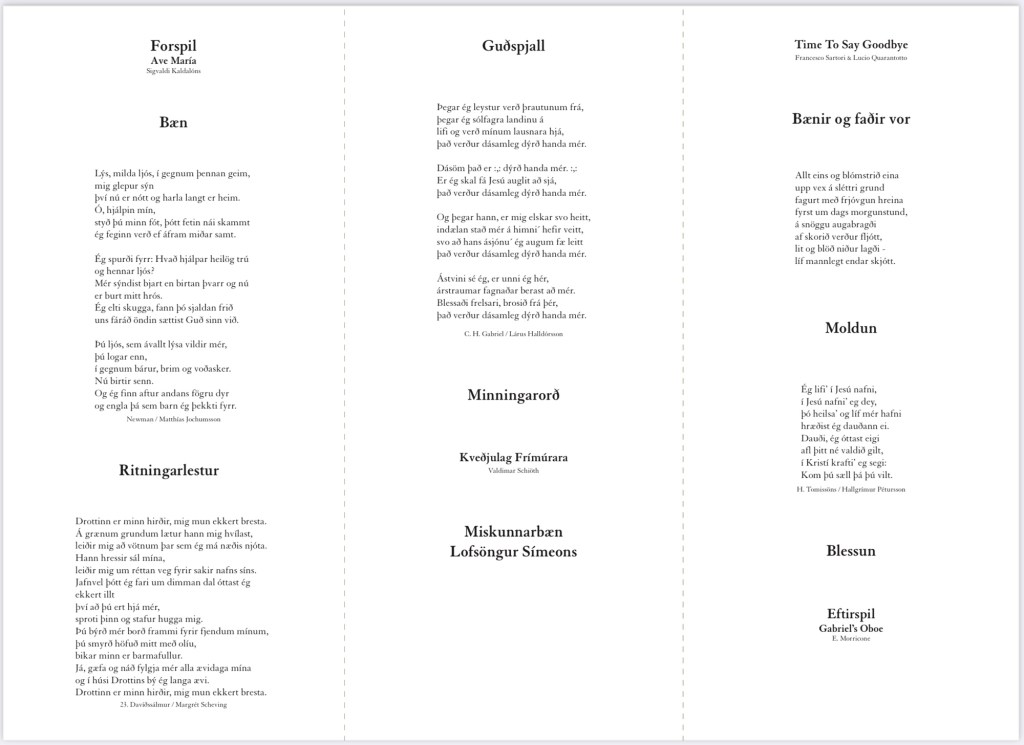 – Í þriðja lagi, að skynja sig í hinu stóra semhengi alls sem er, að við skynjum okkur sem börn Guðs í heimi hans og láta um okkur muna þar, gefa fólki forgjöf – fyrirgefningu – gefa af okkur sjálfum með hjálpsemi, heimsækja sjúka, styðja þau sem standa höllum fæti, reynast öllum vel og gleyma ekki að þakka Guði fyrir lífið, gjöfina stærstu og það gerum við með því að sækja guðshús og efla okkur þannig í guðsþjónustu hins daglega lífs í heimi Guðs.