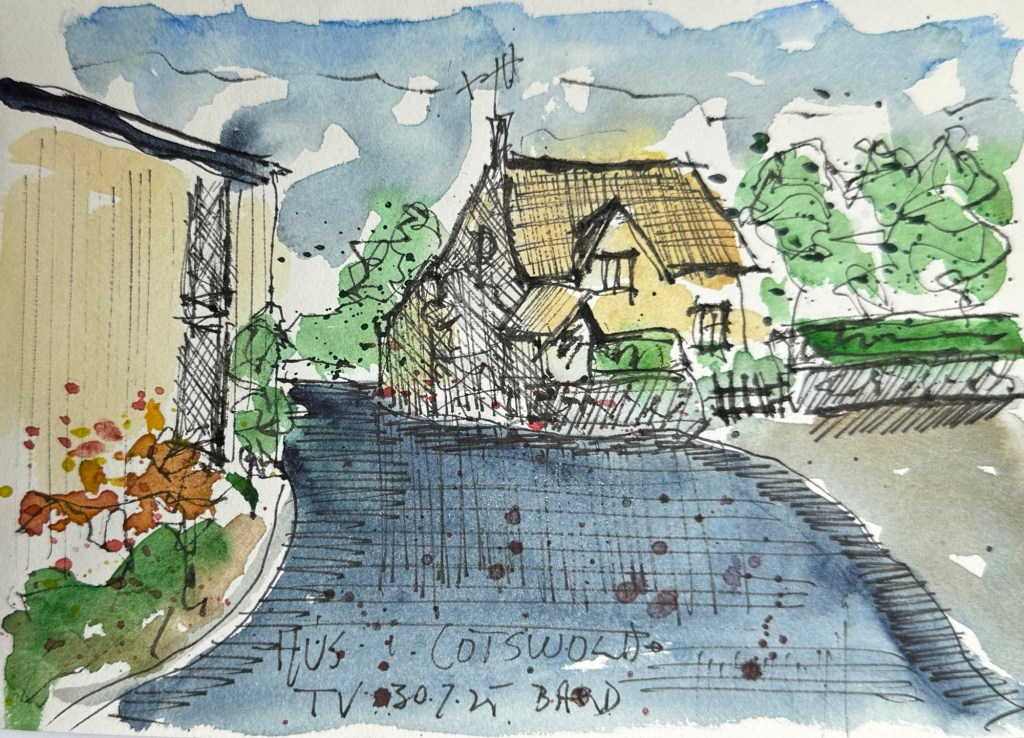 Lenti á spítala og gekkst undir hnífinn. Var á þremur stofnunum í rúman sólahring og þar mætti mér yndislegt starfsfólk frá fjölmörgum löndum. Ég hef það fínt og er þakklátur. Aðgerðin var minniháttar en allt inngrip í kroppinn felur þó í sér vissa áhættu. Teiknaði liggjandi í rúminu á gangi Bráðavaktar við hlið vaktherbergis lækna.Hús á skjánum í útlöndum.Plastkassar á gólfi sem fylgdu mér í afleysingum á Vestfjörðum og á Vopnafirði og Þórshöfn s.l. vetur.Hús á skjánum í Cotswold. Þar er án efa margt fagurt að sjá. Væri gaman að heimsækja staðinn og teikna gömul hús og mótíf!Horft úr Skuggahverfi austur Sæbraut þar sem turnar og byggingar af ýmsu tagi standa. Sæbrautin er eins og fljót þar sem sjálfrennireiðar streyma daga og nætur. Í beygjunni geri ég ráð fyrir að Rauðará hafi áður runnið til sjávar og geri e.t.v. enn í ræsum.Hlutaði á Rupert Sheldrake flytja fyrirlestur á Netinu í erlendri kirkju um „pan-en-the-isma“ sem fjallar um það að Guð sé í öllu efnislegu. Skemmtilegar pælingar sem sumar stangast á við hefðbundna, kristna, guðfræði. En hvað með það? Gott að hlusta og pæla í öðrum hugmyndum en þeim sem maður sjálfur aðhyllist.