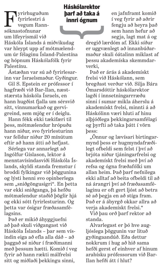 Þarf Ingólfur Gíslason, lektor ekki að taka pokann sinn? Hann er lektor við skólann og hafði sig víst mjög í frammi ásamt æstum hópi „atvinnumótmælenda“ undir fána Palestínu.