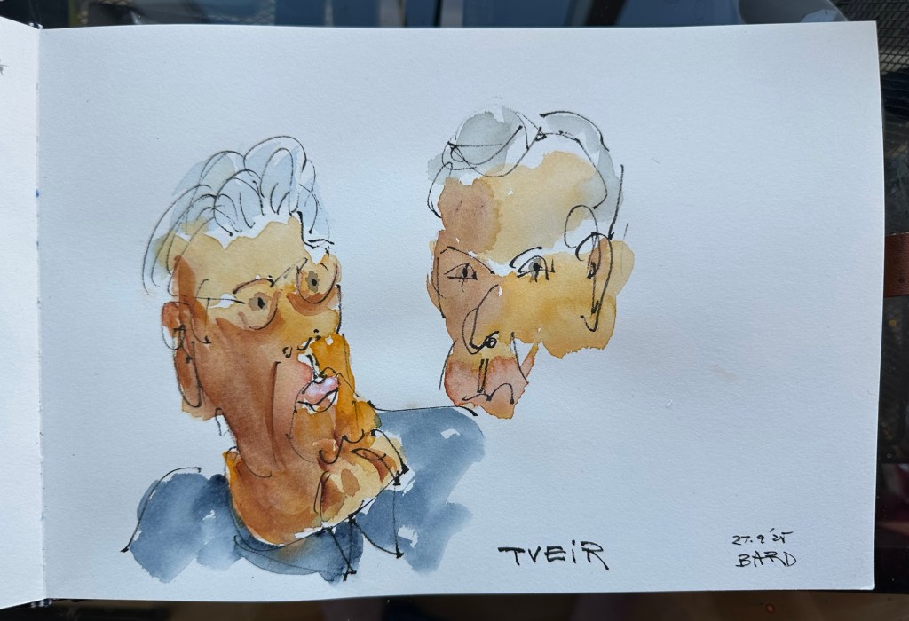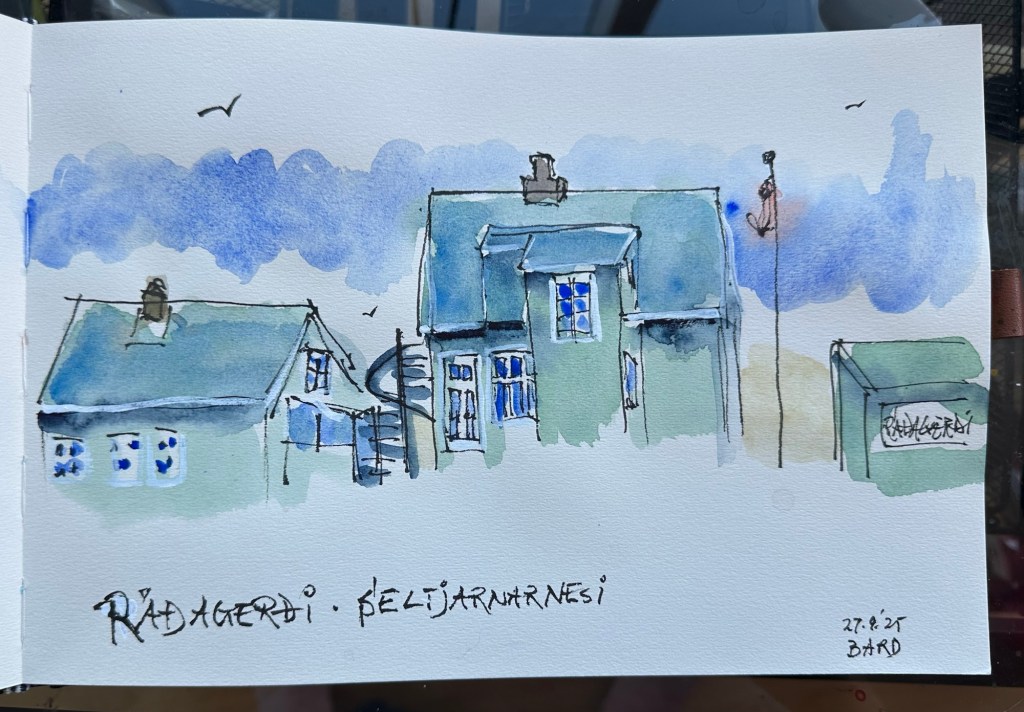 Á leiðinnin til baka ók ég inn á lóð Ráðagerðis, skissaði og hitti svo tvo í kaffi.