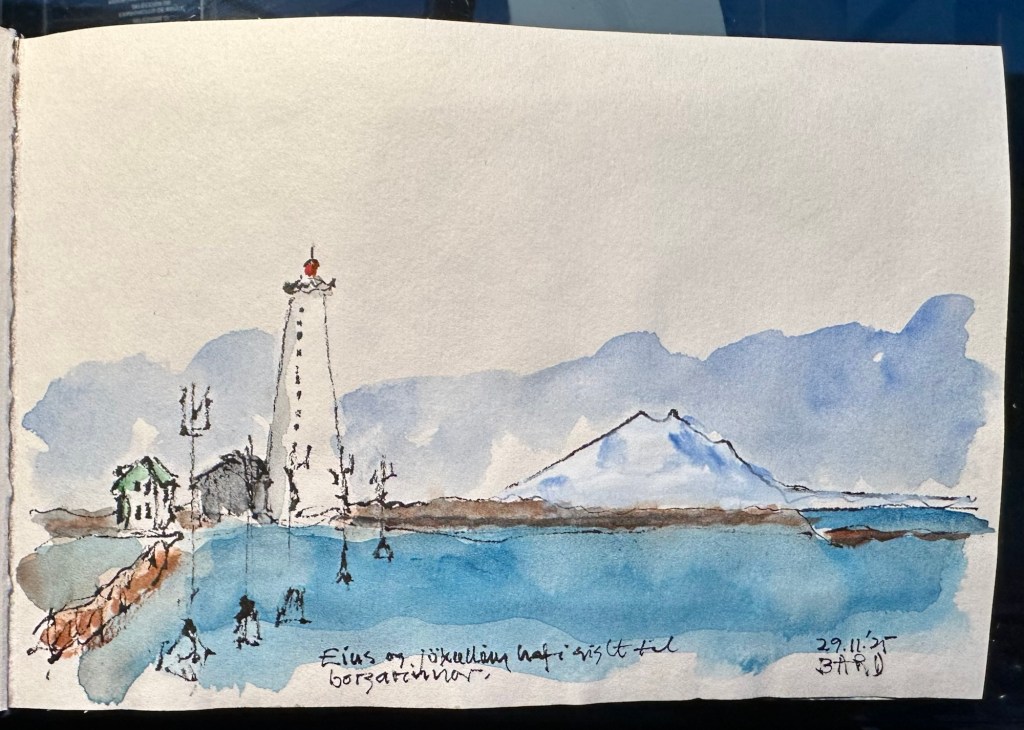 Akranesbær svífur sem í tíbrá með snæviþakin nesin tvö að baki