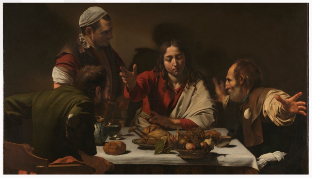 Þegar þeir voru komnir til Emmaus settust þeir að snæðingi og þegar ferðalangurinn, sem slegist hafði í för með þeim og túlkað alla hjálpræðissöguna, tók brauðið og braut það, lukust upp augu þeirra og þeir þekktu hinn upprisna Krist – sem hvarf þeim við svo búið.