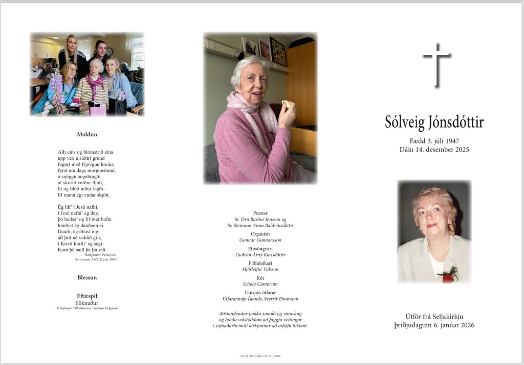 Guð blessi minningu Sólveigar Jónsdóttur og Guð blessi þig, sem enn ert á lífsveginum þar sem Kristur býður þér sína hjálp við að leysa úr gátum lífs og þrautum daganna, og fylgir okkur að lokum í trúnni til himinsins heim.