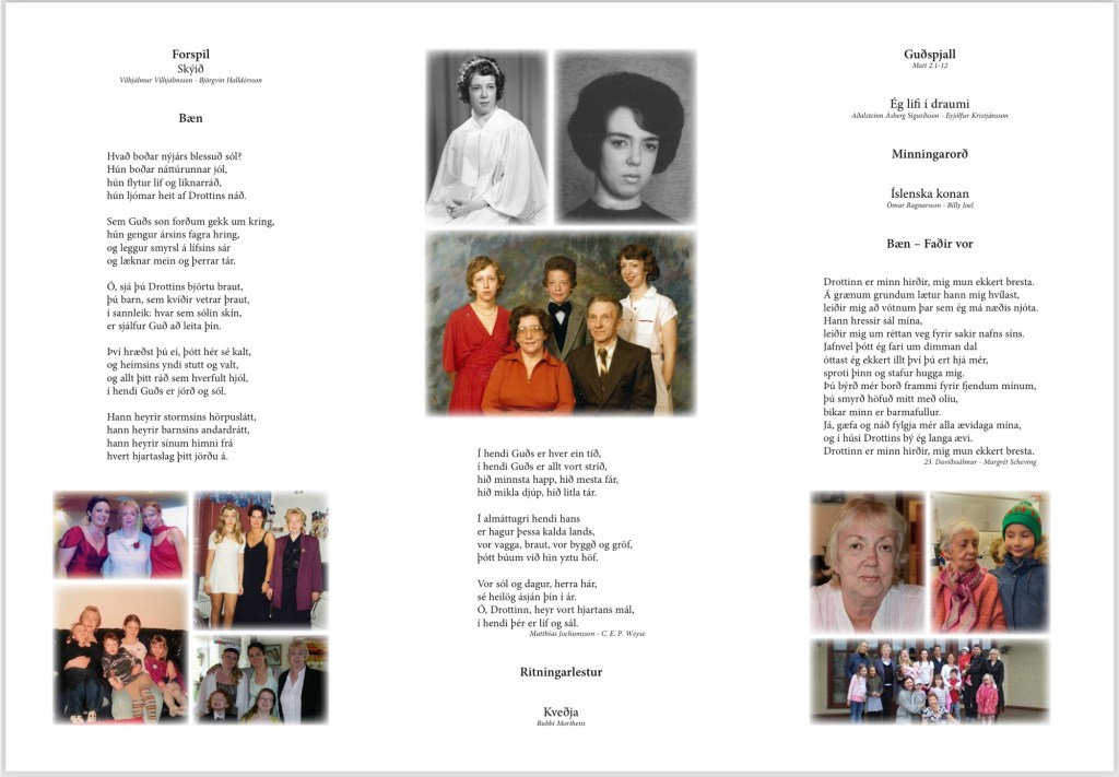 Alzheimers í miðjum Covid-faraldrinum árið 2020. Henni hrakaði hratt og fékk búsetu á hjúkrunarheimilinu Grund í lok árs 2022. Þrátt fyrir veikindin leið henni vel þar eins og allsstaðar þar sem hún kom á sinni ævi. Hún eignaðist góða vini og linnti vel við alla, hvort heldur voru heimilismenn eða starfsfólk. Og starfsfólkið talaði einmitt um það hvað hún væri alltaf blíð og góð og vildi aldrei láta neitt hafa fyrir sér. Enda var það þannig alla tíð með þessa duglegu konu.