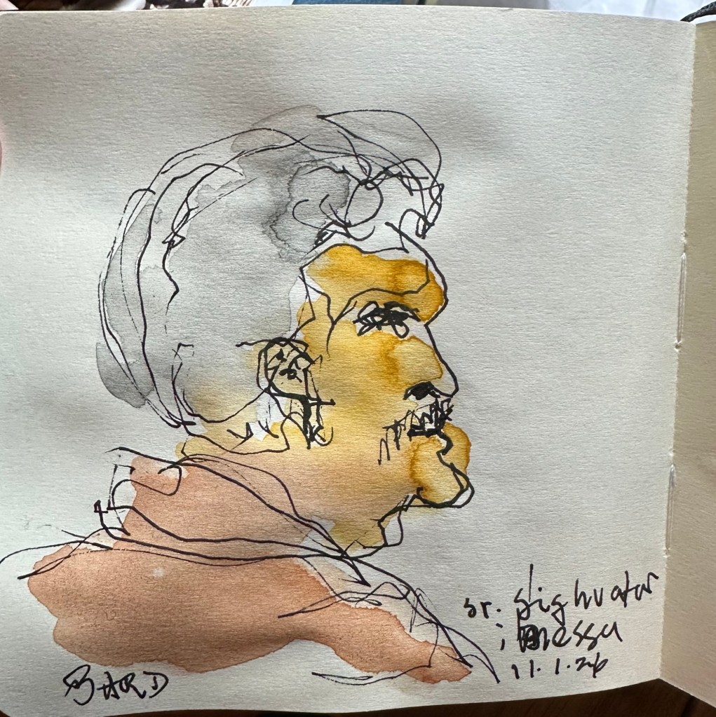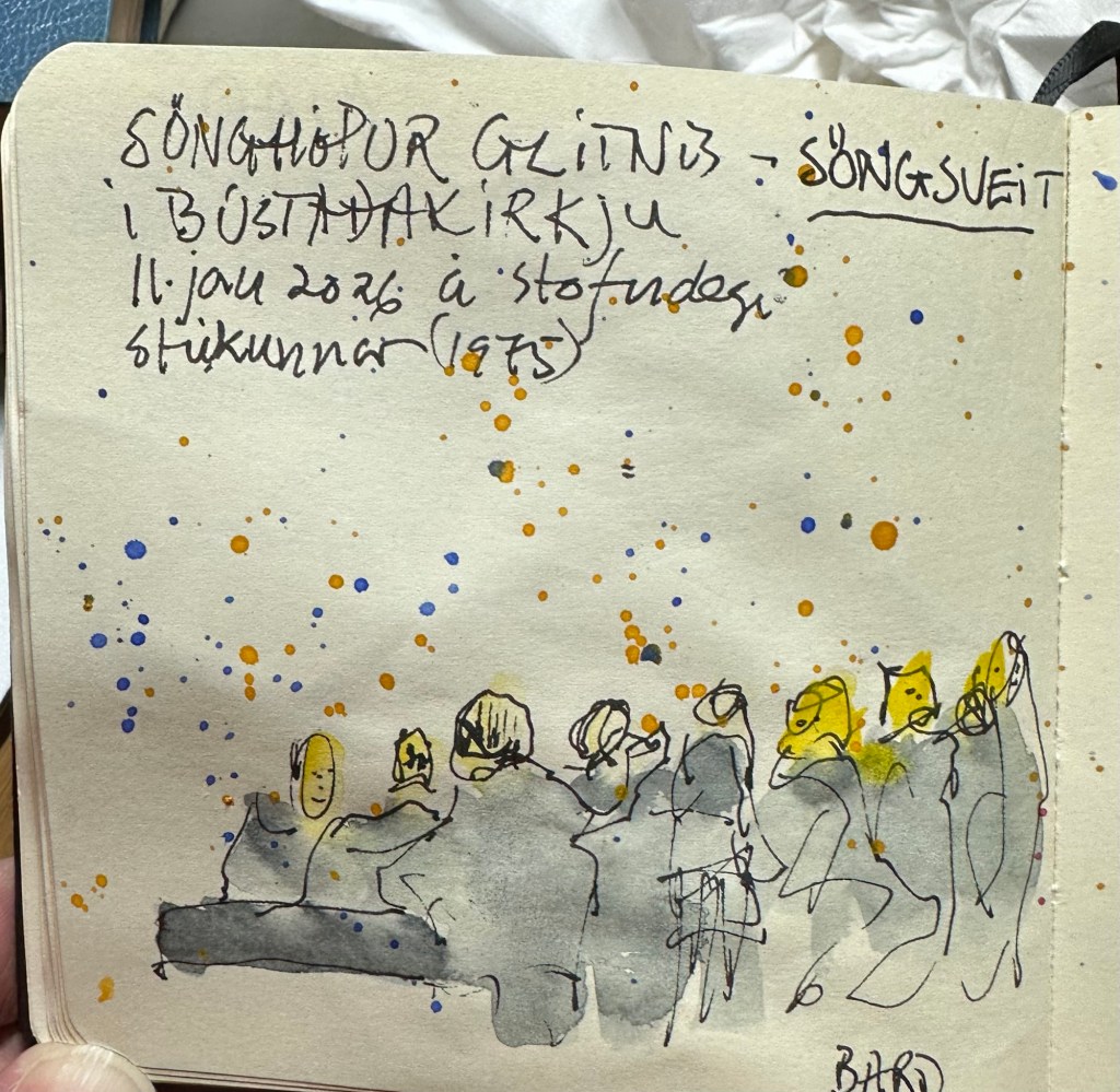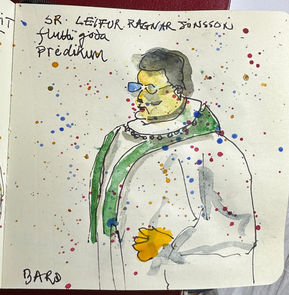 Ég skissaði 3 myndir meðan á messunni stóð og birti þær hér með beiðni um að sjáendur taki viljann fyrir verkið.