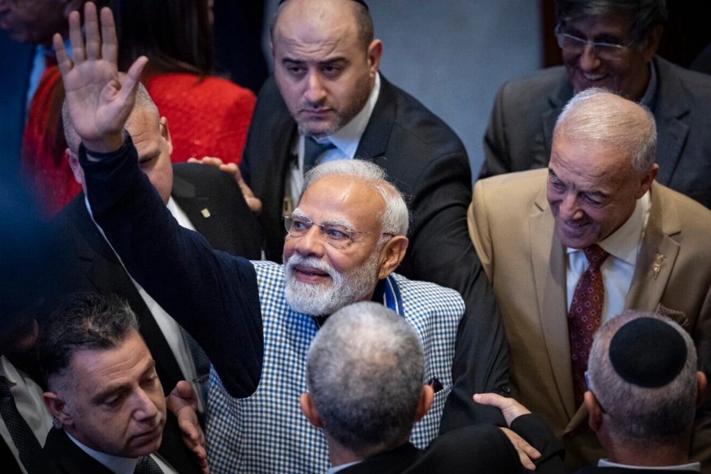 Narendra Modi, forsætisráðherra Indlands, veifar á sérstökum þingfundi honum til heiðurs í Knesset, 25. febrúar 2026.