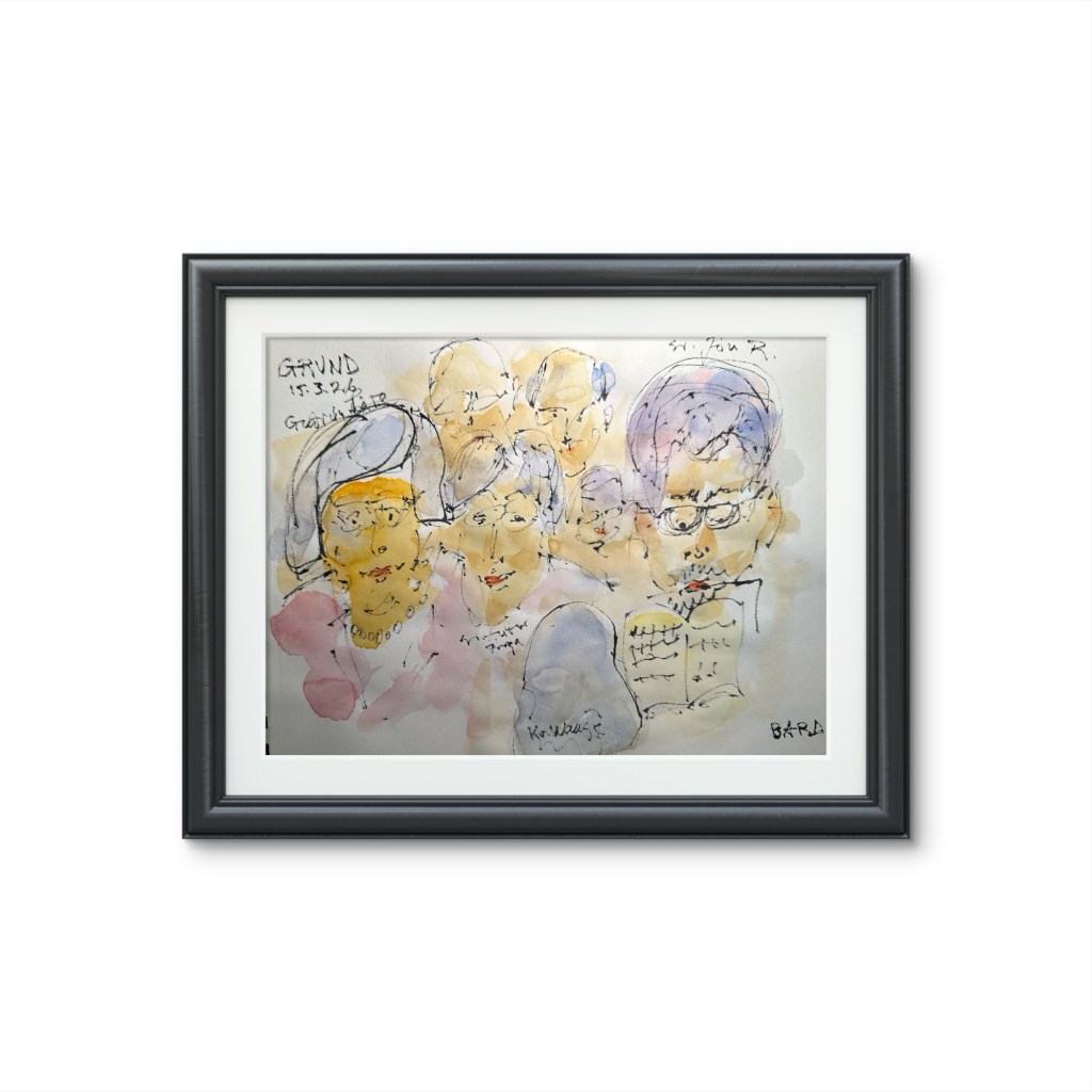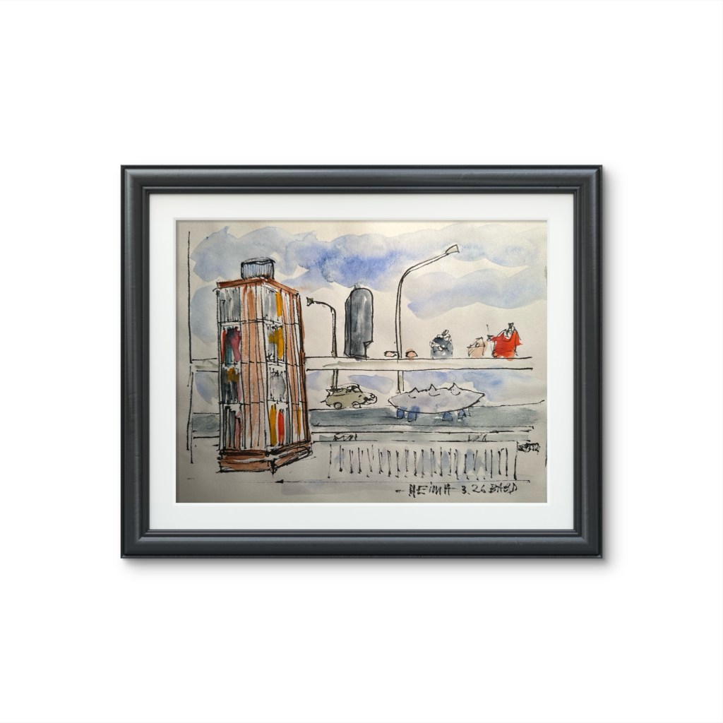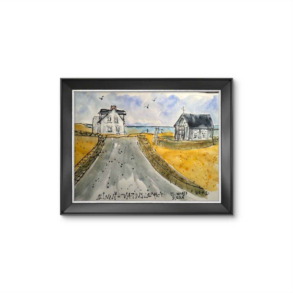 Teiknað með penna og vatnsheldu bleki, litað með vatnslitum.