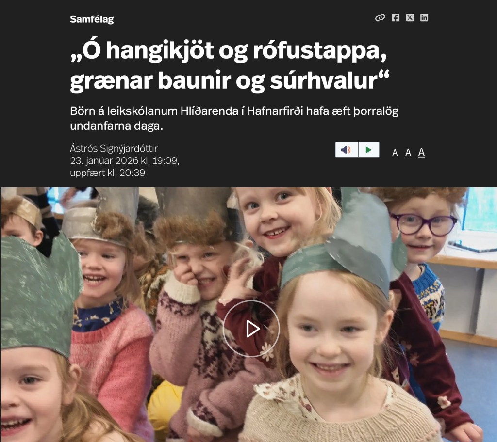 Börnin sungu í leikskólanum um þorramatinn og við sáum þau glöð í fréttum RÚV en svo var þar líka frétt af þórrablóti Stjörnunnar í Garðabæ og þá voru þar fullorðnir karlar, veislustjórar, sem voru eins og viðrini og annar þeirra kúgaðist hreinlega við að smakka lundabagga. Þessir sögufirrtu strákar virðast hvorki vita né skilja að það var afrek þjóðarinnar að lifa af veturinn í þúsund ár án yls í húsum, fyrstikista og ísskápa. Engar búðir voru í landinu og allt unnið heima. Því varð að geyma matinn í súr sem var unnin úr mólkinni úr kúnni og þegar leið á aldirnar kom innflutt salt sem gerði fólki kleift að setja matinn í salt. Súrir lundabaggar eru góðmeti, reykt kjöt sem við köllum hangikjköt líka, fiskurinn var þurrkaður í skreið, bleyttur upp og soðinn sem slíkur og af honum keimur sem við kunnum að njóta sem ólumst upp við að borða fisk fimm sinnum í viku, soðinn, saltaðan, siginn. Og svo borðaði maður hákarl löngu áður en maður mátti smakka brennivín sem fullorðnir verða að hafa til að skola lostætinu niður og þar með deyfa eðalbragðið.